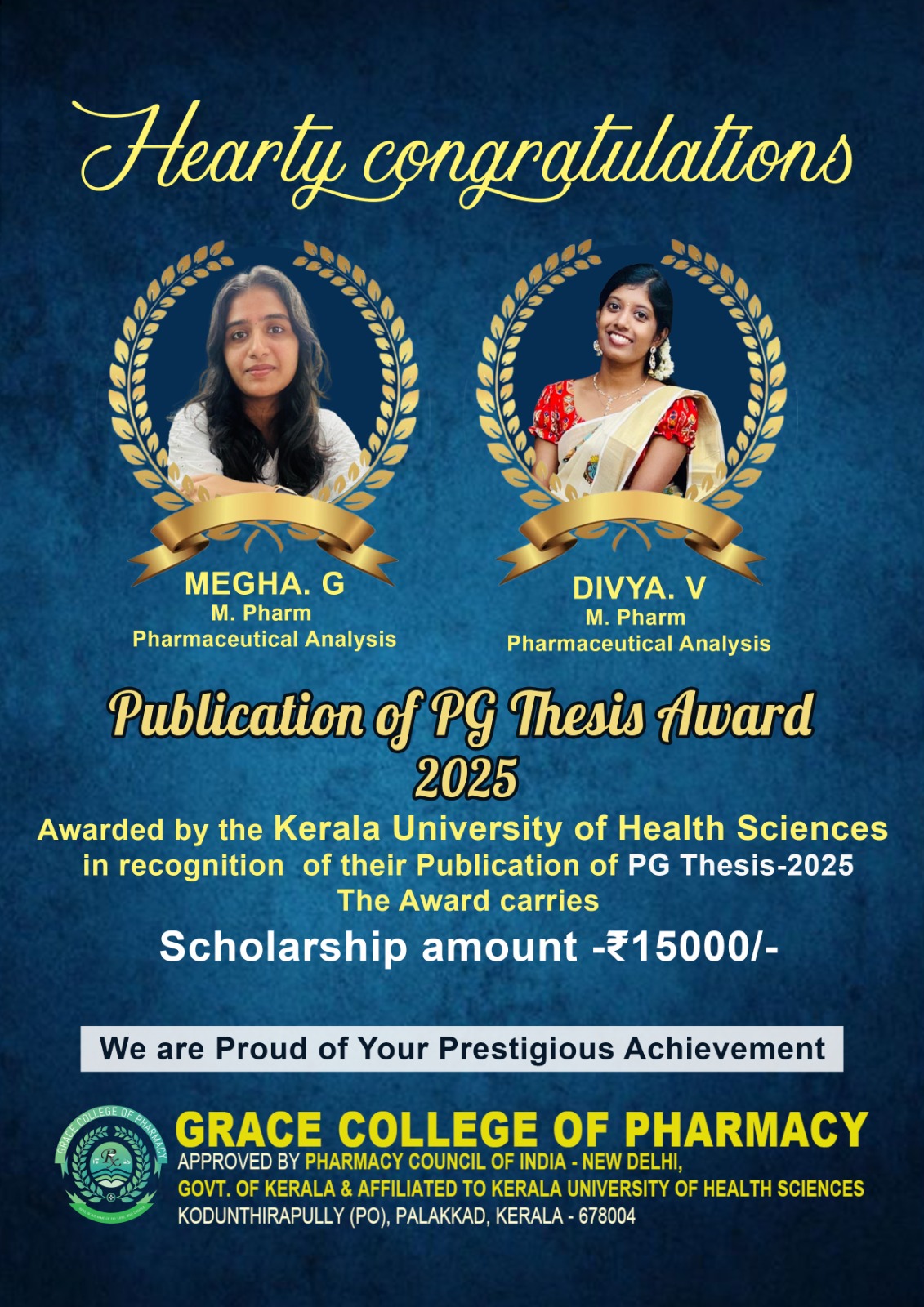 In addition to that, Ms. Sangeetha, the first rank holder in B.Pharm (KUHS 2025) has been awarded the meritorious scholarship to pursue her M.Pharm Program at Grace College of Pharmacy for upcoming years 2025-2027 batch.